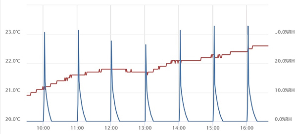 A visual and audible alarm is triggered when the humidity exceeds the set parameters.